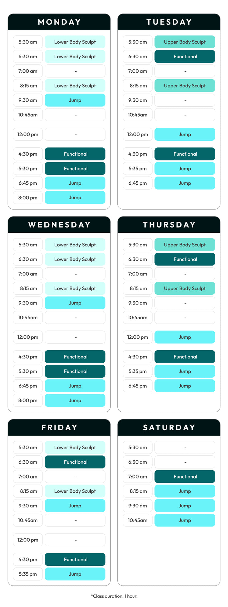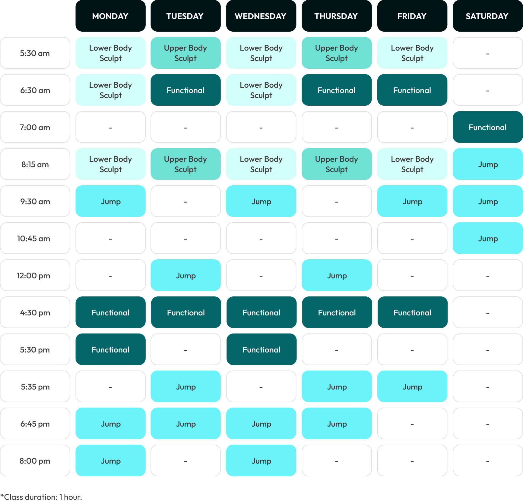 Jump Class is a workout that elevates your fitness through trampoline exercises. You'll bounce, jump, and rebound on specially designed trampolines, enhancing cardiovascular endurance while building strength and agility.